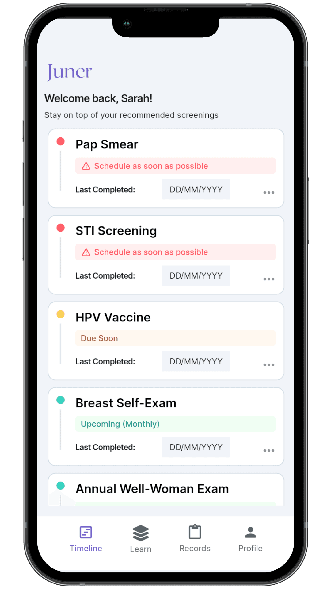 Juner is a comprehensive reproductive health tracking app designed to help you manage all your essential health checks in one place. From Pap smears and hormone tests to routine screenings and check-ups, Juner ensures you never miss important appointments and stay on top of your reproductive health.